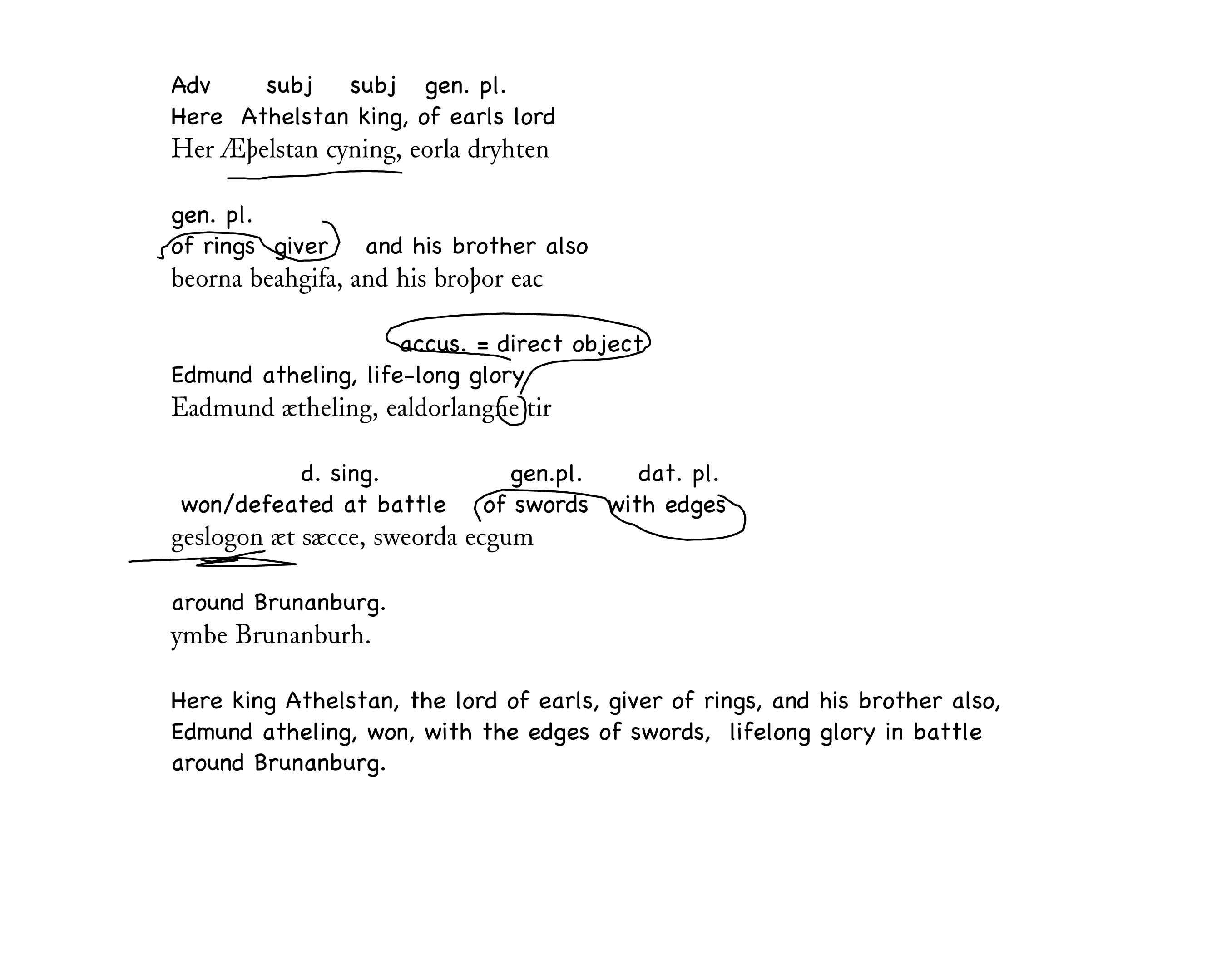 If you make a special effort to understand the grammar of the sentences you are translating, you will soon be able to appreciate the beauty and power of Old English poetry. We recommend that you begin with some of the poems from the Exeter Book, perhaps "The Fortunes of Men," "The Panther," and "The Whale." When you have more of a grasp on Old English poetic syntax, move up to the much-loved "elegies," including "The Wanderer," "The Seafarer," and "The Wife's Lament."